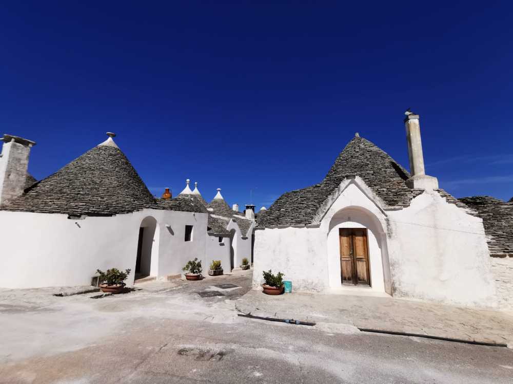 Nach dem Frühstück geht es zu den berühmten Trulli von Alberobello – runde Häuser aus Trockenmauern mit spitzen, weißen Kegeldächern.