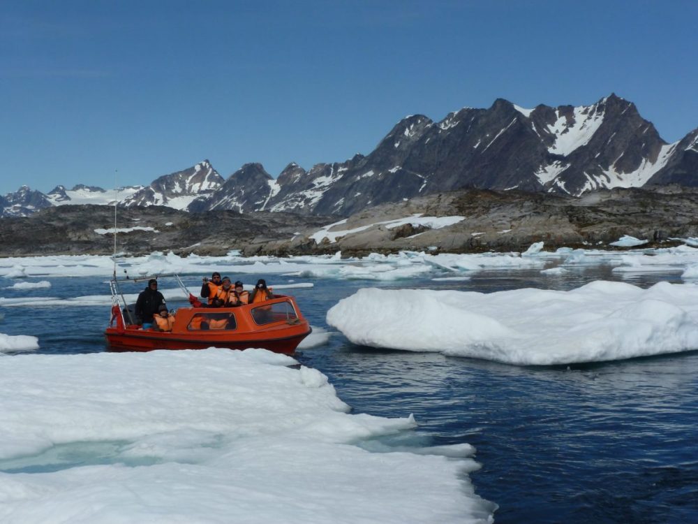 Ihr brecht das Camp ab und fahrt mit Booten in die Außenfjorde – vorbei an Felsen, Treibeis und weiten Wasserflächen.