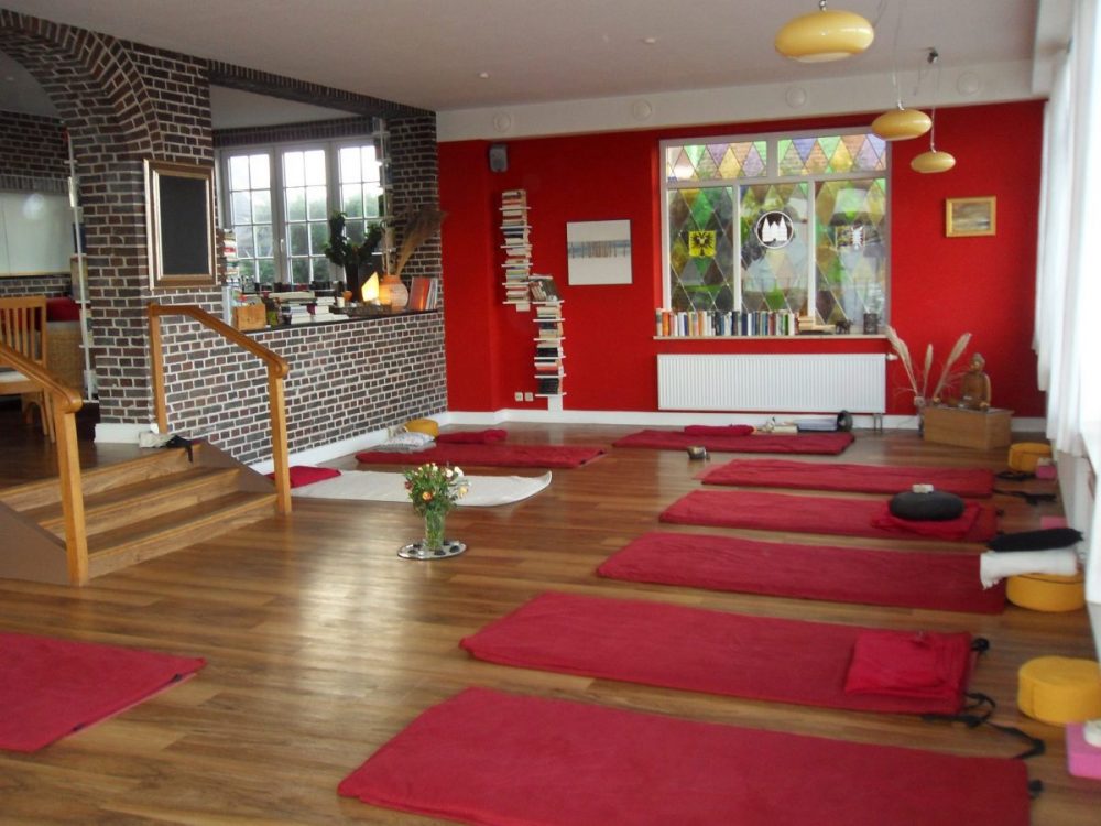 Yogamatten und Meditationskissen sind vor Ort vorhanden.
